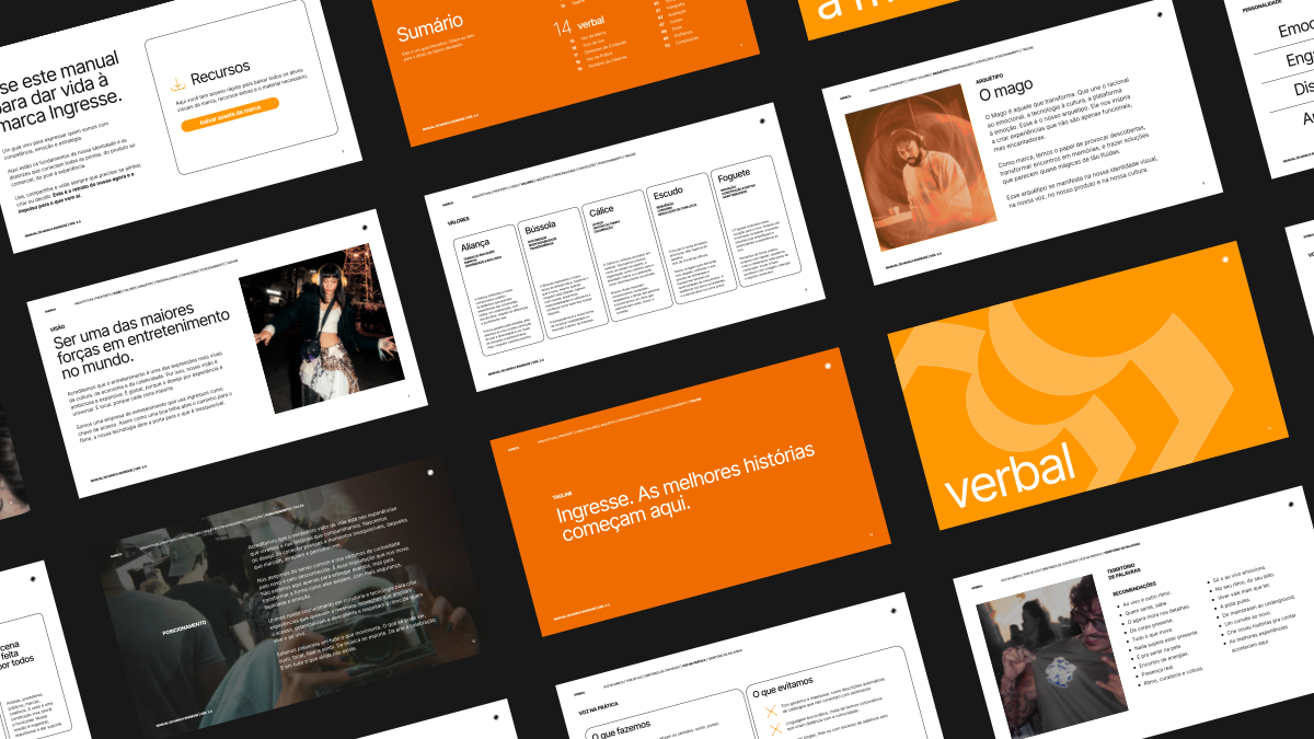 Ao assumir a liderança criativa da Ingresse, identificou-se a necessidade de estruturar os ativos visuais e verbais da marca, que até então estavam dispersos. Sem um rebranding formal, o desafio foi organizar, padronizar e consolidar a identidade para garantir consistência e força comunicacional, alinhadas à expansão no mercado de entretenimento ao vivo.